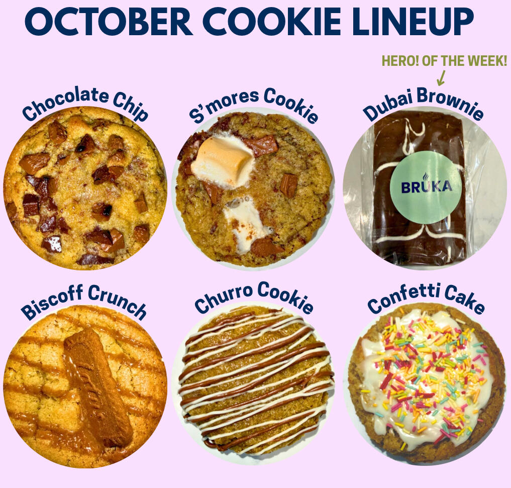 The box Bruka fans can’t resist, the Hero Box includes 5 chunky cookies plus 1 surprise Hero item — a limited‑edition flavour or special bake from the weekly menu, all freshly baked to order with FREE UK delivery shipped every Friday.
